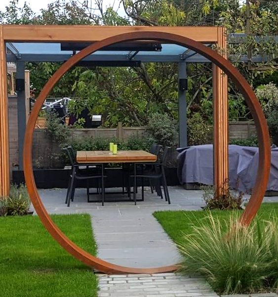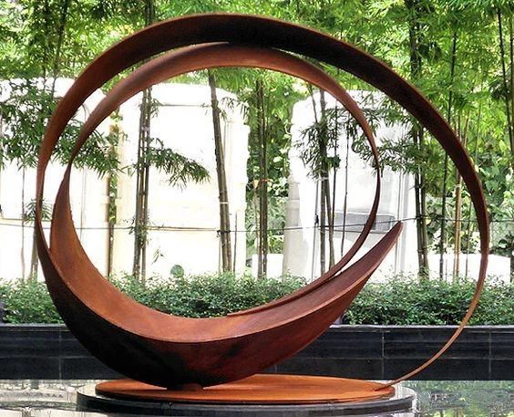 As it weathers, the Corten steel forms a rich, textured rust-like patina that deepens in character over time—enhancing its earthy aesthetic while protecting the structure beneath. Whether placed as a standalone statement piece or integrated into a broader garden design, this sculpture adds a sense of elegance, movement, and permanence to any outdoor setting.